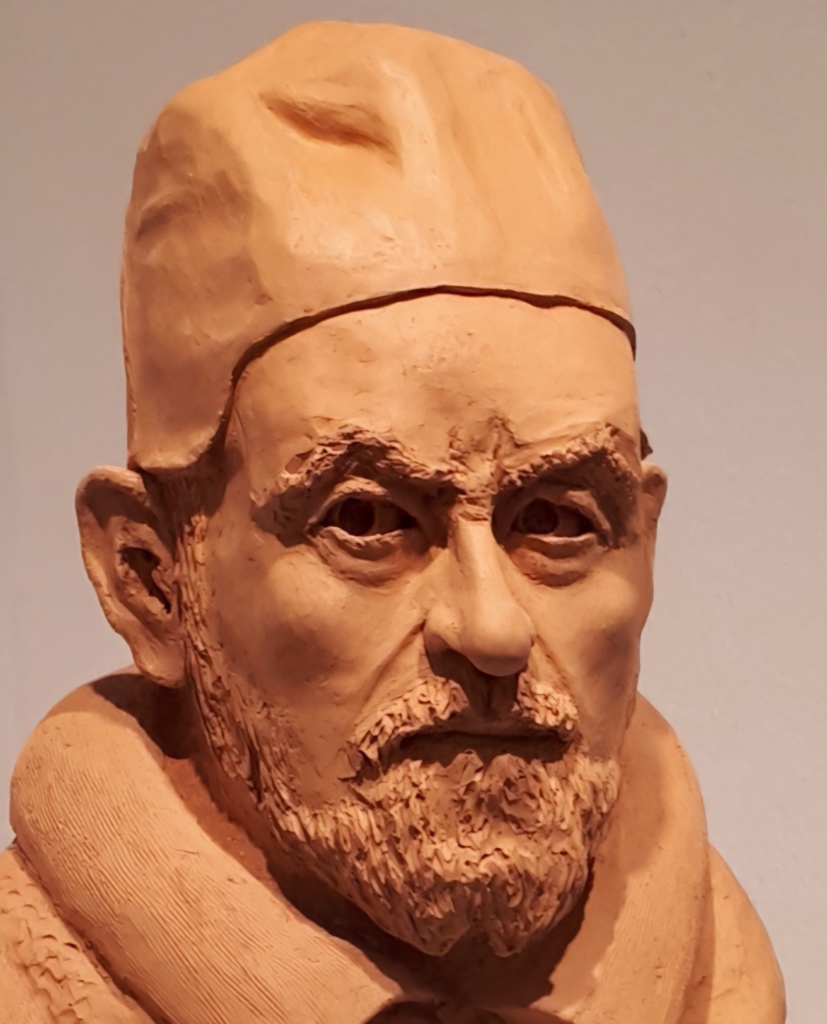 Esta escultura la realicé en 2016 y provocada por la fortísima impresión que me causó la contemplación del extraordinario retrato que Diego Velazquez le realizó al papa Pamphili, Inocencio X y que está colgado en el Palacio Doria Pamphili de Roma, está realizada en terracota y es mi versión y mi interpretación en 3D de dicho retrato y aunque no conseguí ni mucho menos recoger un poco de la fuerza y de la tensión que tiene uno de los mejores retratos de la historia del arte, si me quité un poco la obsesión que tengo con él desde que lo contemplé en aquel recodo del Palazzo Pamphili de Roma.